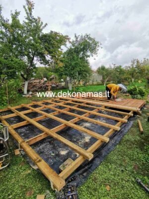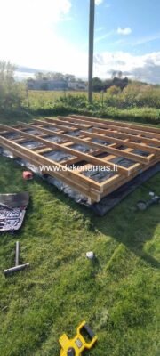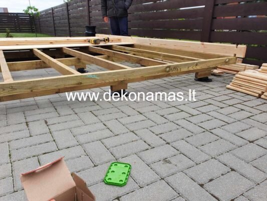 4. Statybos būdas su dvigubu karkasu ant nelygaus trinkelių ar betono pagrindo išlyginant pades – reguliuojamos atramo, pjedes stalai.